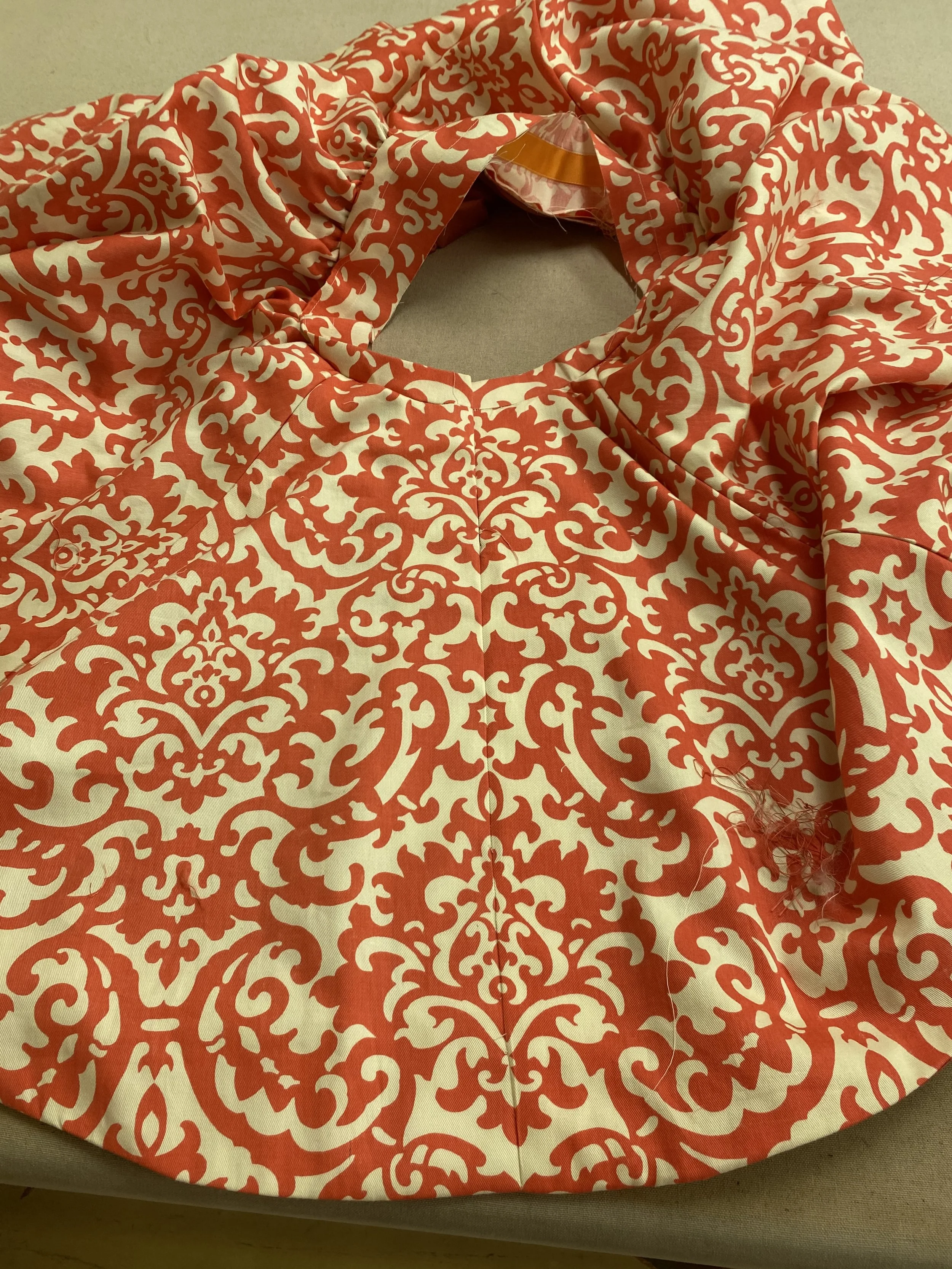 Robe en chemise, gathered front, contrasting waistband, double puff sleeves with hem ruffle, pieced lace to hide darts and seams