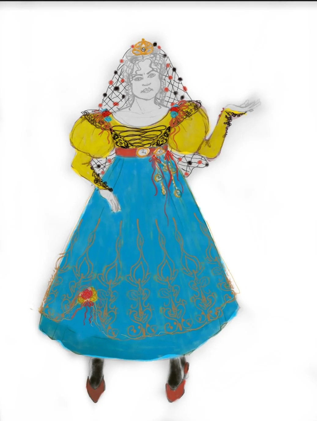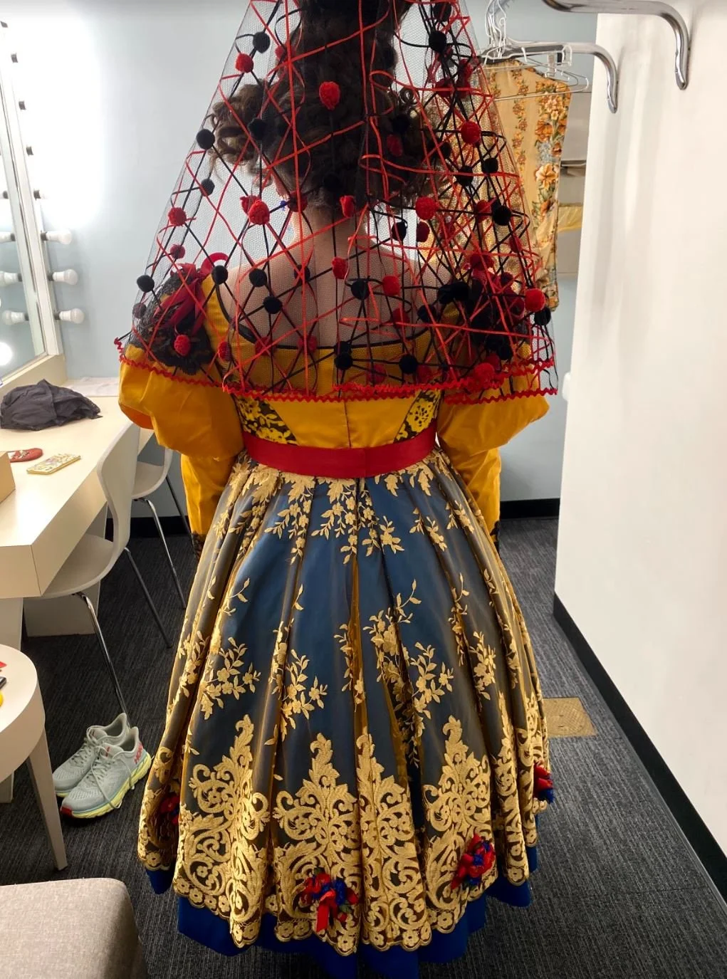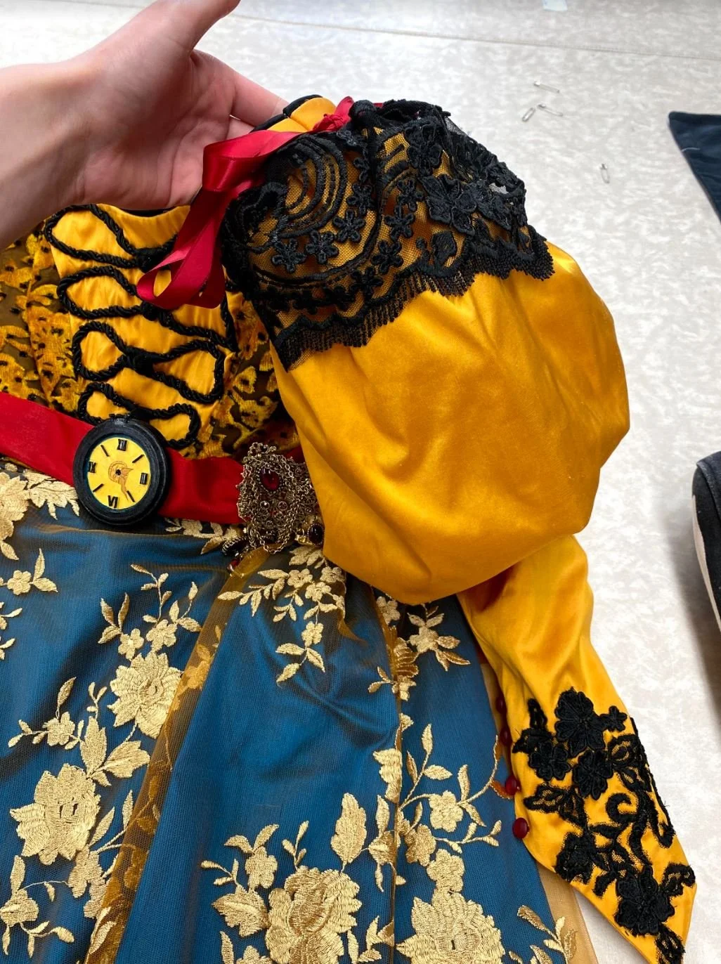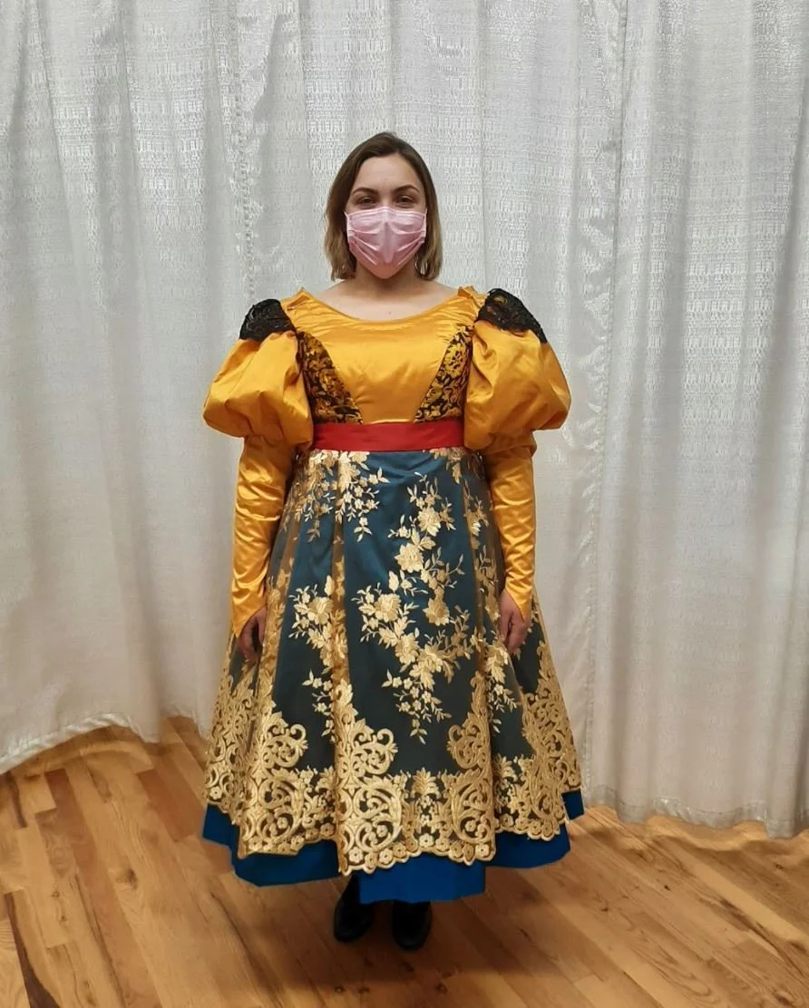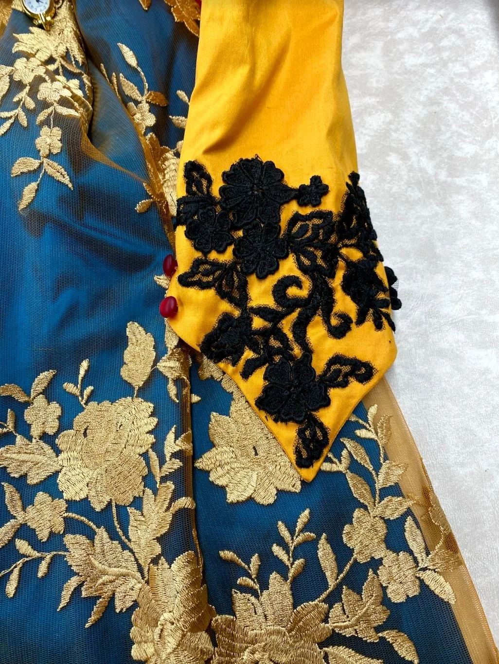 Boned bodice with burn out velvet overlays and hand-stitched corded design down CF, puff sleeves and inner control sleeve with hand-stitched lace appliques, knife pleated skirt with lace overlay and several bouquets