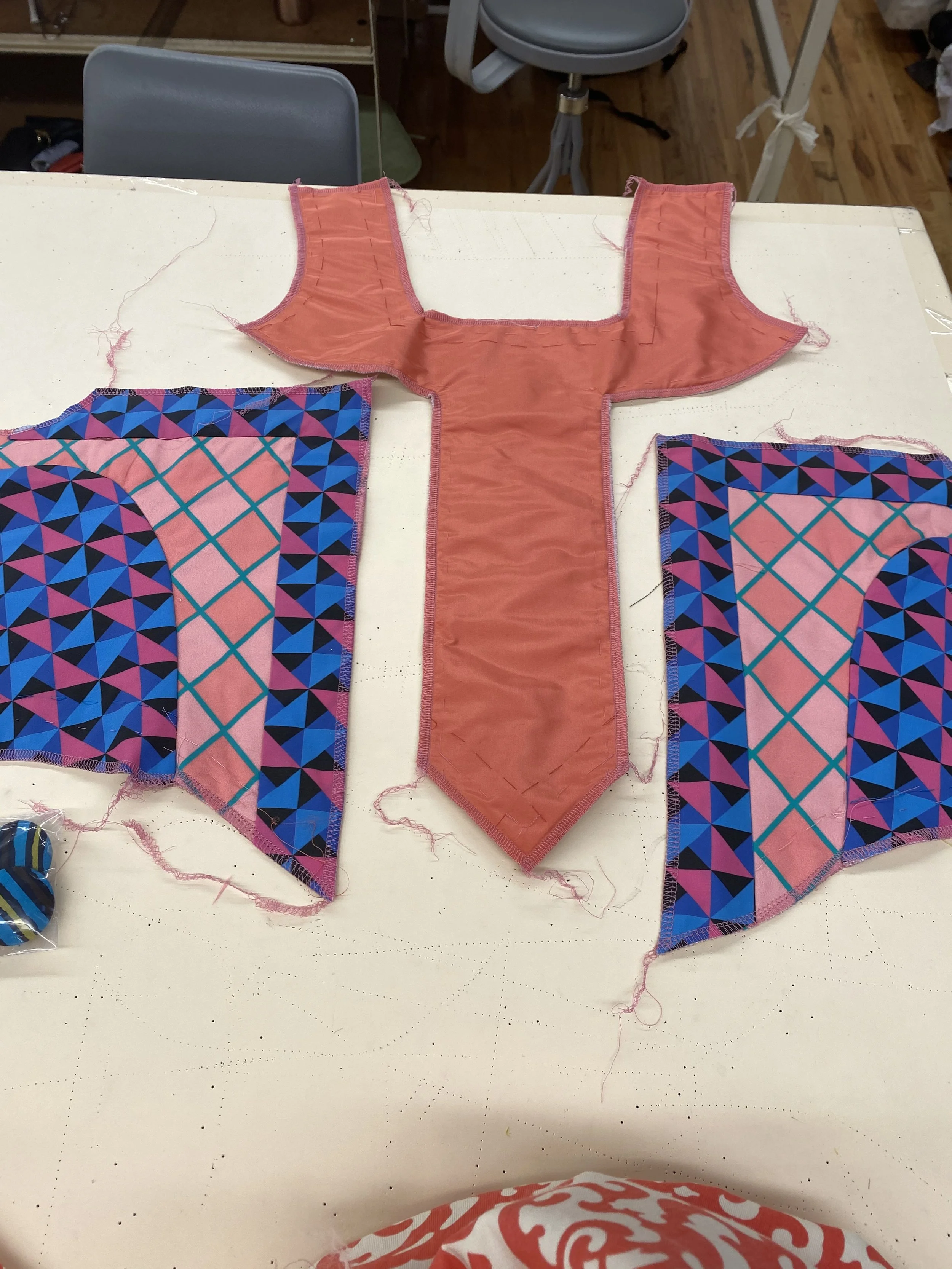 Boned Bodice with sleeves, knife pleated underskirt fitted over panniers with bubbled overskirt pleated up with ribbons
