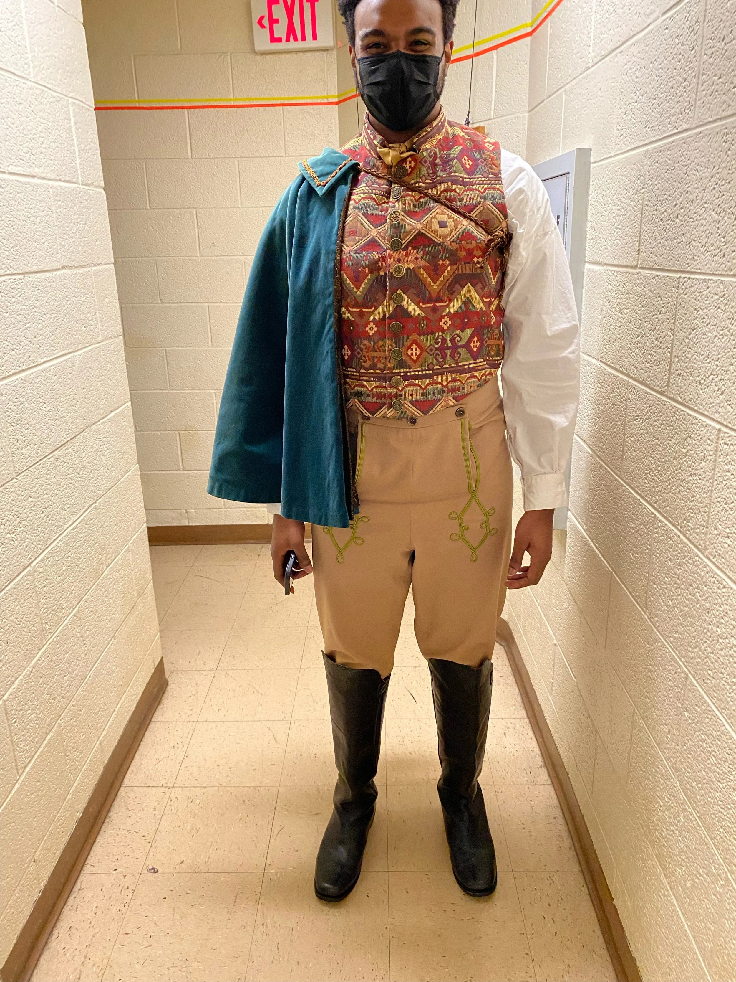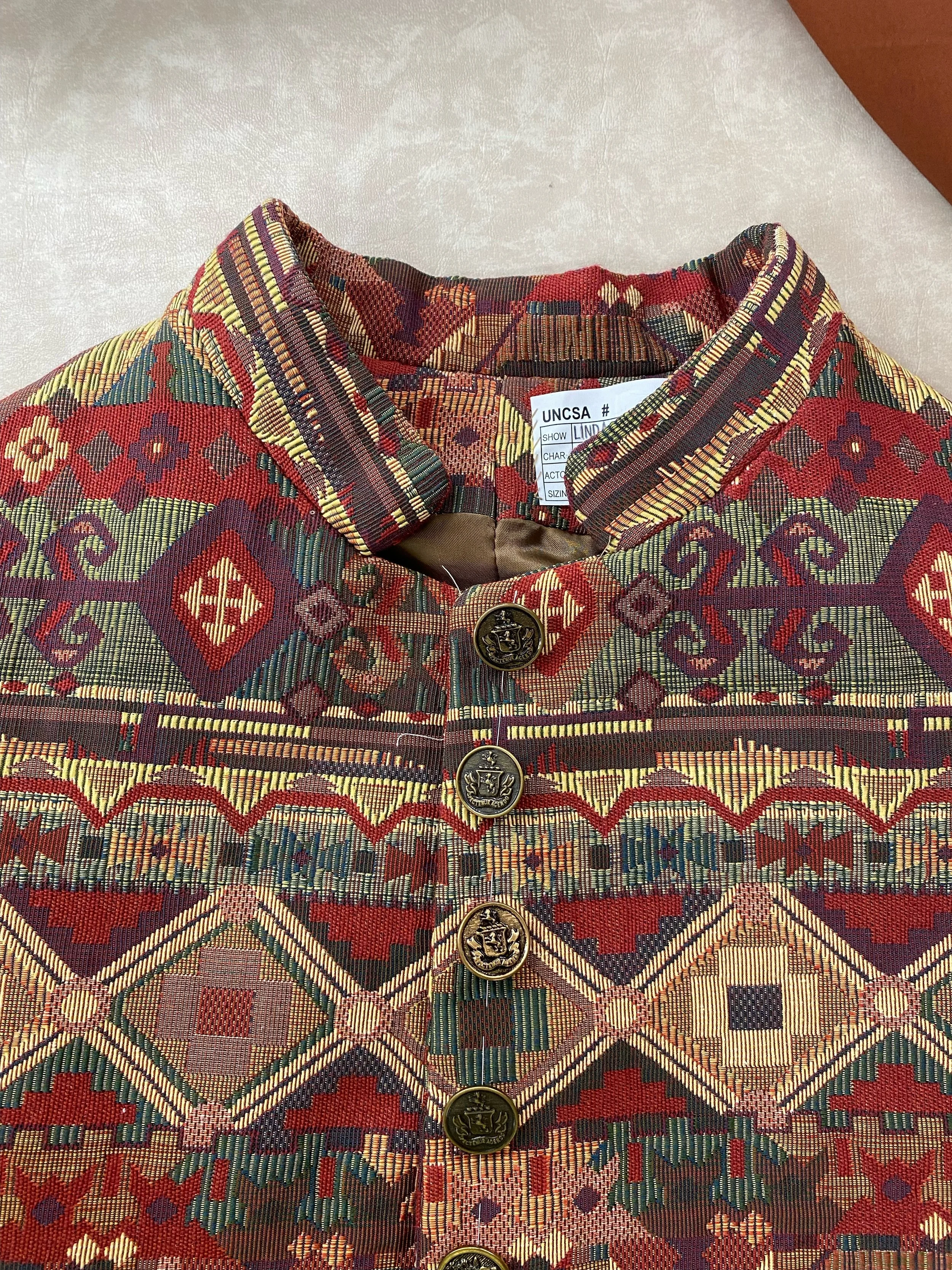 Tight fitting, fall front pants with hand made soutache appliques, one pair later adjusted to accommodate orthopedic leg brace.